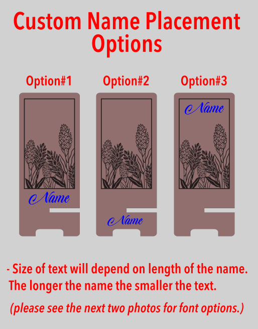 Add a name to your phone stand to create the perfect custom gift! When adding a name please be sure to verify spelling as I will write the name EXACTLY as you type it into the text box. Please refer to the sample photos for name placement.